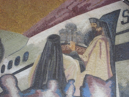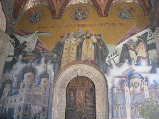În stânga, incredibil dar adevărat, o coadă de avion. Din avion coboară o raclă pe care o preiau câţiva călugări. Pe coada avionului, ochii mi s-au proptit în cele câteva cercuri olimpice. Fără să pot dibui legătura sfintelor moaşte cu olimpiadele şi nefiind expert în siglele companiilor aviatice, am aflat mai târziu că simbolul nu avea legătură cu vreo competiţie sportivă, ci cu „Olympic Airways”. În centrul „tripticului”, procesiunea cu sfintele moaşte. În dreapta, ca şi cum cineva s-ar fi temut ca nu cumva să uităm cum a fost transportată racla, reapare coada avionului; de data aceasta, racla este urcată înapoi. În ghidul pe care îl aveam la mine, am citit următoarea explicaţie: „Mozaicul bizantin realizat între anii 1999-2000 în pridvorul deschis al bisericii de către echipa meşterului Virgil Moraru reprezintă patru scene din Paradis şi evenimentul aducerii moaştelor Sf. Apostol Andrei la Iaşi, în octombrie 1996” (Pelerin în Iaşi, Mitropolia Moldovei şi Bucovinei, Trinitas, Iaşi, 2000, pp. 13-14.). Ce e drept, vestea proastă a tonului absolut aprobator adoptat de o publicaţie oficială a Mitropoliei Moldovei la adresa ororii, era îndulcită de o ştire formidabilă, pe care nu ştiu cum mi-am permis, mai ales ca istoric, să o ignor până acum: în anul 2000, se vede treaba, Bizanţul exista încă, de vreme ce echipa meşterului Moraru a realizat un mozaic bizantin… Curat  bizantin!